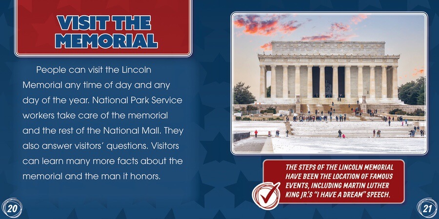 The Lincoln Memorial in Washington, D.C., makes the president larger than life—much larger. The 19-foot-tall marble statue recalls the enormous impact Abraham Lincoln had on U.S. history. The American landmark honoring the leader who preserved a nation following a civil war is a must on every young historian's travel list. Readers of this book, with key curricular social studies content, will learn interesting background information about both the president and his stunning monument through engaging and accessible text paired with supporting colorful photographs.